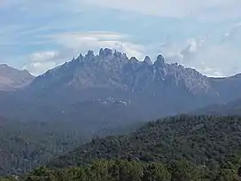 The Aiguilles de Bavella (Corsican: I Forchi di Bavedda; Needles of Bavella) are rocky spikes of red granite[1] that dominate the hill of the same name on the island of Corsica in France. At 1218 m, the hill connects the Alta Rocca to the east coast of Corsica. This massif is smaller yet much more popular than the "aiguilles de Popolasca". The site is characterized by jagged peaks, large rock walls and pine trees twisted by the wind.