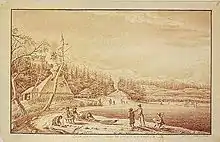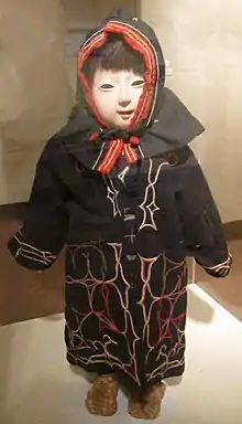 In archaeological terms, Ainu culture is marked by material cultural features such as iron pots, lacquerware bowls, sake chopsticks, bone hunting tools, hooked harpoons for salmon fishing, and extended burials.[8] The Ainu culture is also known to have had regional differences. According to Rinzō Mamiya's Hoki Bunkai Yōwa, the Sakhalin Ainu adopted cultural elements from surrounding cultures, such as the use of dog sledding and skiing. In the early modern period, they retained cultural elements found in the Okhotsk culture in northern Hokkaido, such as the production of earthenware and the use of pit-houses during the winter. The shape of the armor also differed from the Hokkaido Ainu, with a unique combination of chest and waist armor.[9]