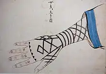 The policy of the Matsumae domain was that the Ainu should "not be influenced by the culture of Japan", and the Ainu did not use the Japanese language or accessories like the kasa (hat), mino (straw cape), or zori (sandals), or other Japanese-style clothing.[27] However, when the territory came under the direct control of the Edo shogunate, the ban on wearing hats, coats, and sandals, which had been forbidden by the Matsumae clan, was lifted. At the same time, the Shogunate recommended changing their hairstyle, clothes, and names to the Japanese style. However, it did not become very popular.