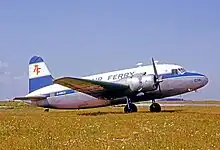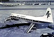 Air Ferry started operations on 1 April 1963, providing IT charters from Manston Airport near Ramsgate, Kent, in south east England.[1][3][4] It initially operated two 40-seat Vickers Viking and two 80-seat Douglas DC-4/C-54s piston airliners.[3] Before the start of operations, the Air Transport Licensing Board (ATLB) had awarded Air Ferry three A-type licences to operate scheduled services from Manston to Le Touquet, Ostend and Verona. Services to Le Touquet and Ostend were due to begin in mid-April 1963 and to Verona on 1 April 1964.[3] (Scheduled vehicle ferry and all-cargo services did eventually start in 1965. These operated between Manston and Le Touquet, Calais, Ostend as well as Rotterdam.)