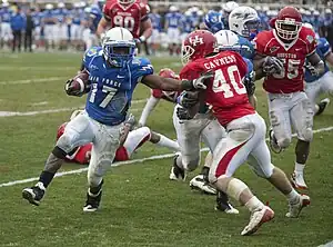 In 2019 Air Force renewed a rivalry with Colorado, winning at Folsom Field on Sept. 14 by a score of 30–23.[10] The teams had not played since Oct. 5, 1974, a game that Colorado won by a score of 28–27.[11] Air Force won the first meeting between the teams in 1958. The 1963 game between the two college football teams was postponed due to the assassination of President John F. Kennedy. The 1973 game, the last one played in Boulder before the 2019 clash, was marred by a riot.[12] Fans threw eggs and beer at Air Force personnel and cadets.[13]