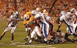 Air Force Academy Falcons free safety Bobby Giannini (#11) prepares to finish off Tennessee tailback Montario Hardesty, while Falcons defensive end Josh Clayton (#97) loosens Hardesty's grip on the football. The Falcons lost 31–30 in 2006.