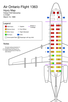Air Ontario Flight 1363 was a scheduled Air Ontario passenger flight which crashed near Dryden, Ontario, on 10 March 1989 shortly after takeoff from Dryden Regional Airport.[1] The aircraft was a Fokker F28-1000 Fellowship twin jet.[2] It crashed after only 49 seconds because it was not able to attain sufficient altitude to clear the trees beyond the end of the runway, due to ice and snow on the wings.[3]