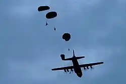 In the mid-1950s, a parachute capability was developed by special forces units, with two Army Reserve Commando Companies formed in 1955 (later placed into a regiment in 1981) and the 1st Special Air Service Company was formed in 1957 (expanded to form the Special Air Service Regiment (SASR) in 1964).[2][9] In August 1958, SLAW was disbanded and the Air Support Unit (ASU) was formed with the PTW renamed the Parachute Training Flight (PTF) and the Airborne Platoon attached to the PTF.[10] Although during the Vietnam War the primary method of insertion used by the SASR was by helicopter, 3 Squadron made an operational parachute jump 5 kilometres (3.1 mi) north west of Xuyen Moc on 15–16 December 1969.[11]
