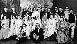 Ğaliyəbanu, directed by Xəkimcan (back, second from left), performed by Tampere Tatars in Helsinki, year 1946. Daughter Aliyə in title role.