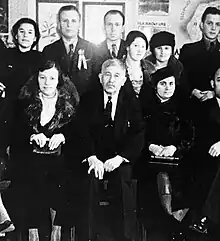 Aisa (back row, second from left) and fellow Tampere Tatars with politician Sadri Maksudi (sitting, middle), year 1920.