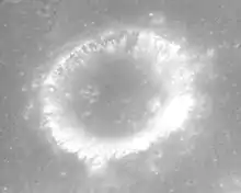 Al-Bakri (Arabic: البكري) is a small lunar impact crater on the northwest edge of Mare Tranquillitatis. It is named after the Spanish Arab geographer and historian Abu Abdullah al-Bakri.[1] It is just south of the eastern arm of the Montes Haemus that borders the Mare Serenitatis to the north. To the east-northeast is the prominent crater Plinius. South of the crater are the rilles of the Rimae Maclear.