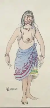 According to some oral narratives, she took the form of an ugly, old woman with a hairy body, long straight hair and breasts so huge that she uses them to wash her clothes.[2] On her head she wore a red hat with a fern twig attached to it.