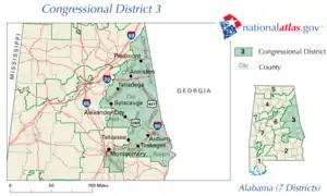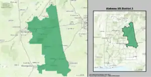 Alabama's 3rd congressional district is a United States congressional district in Alabama that elects a representative to the United States House of Representatives. It is based in east-central Alabama and encompasses Calhoun, Chambers, Cherokee, Clay, Cleburne, Lee, Macon, Randolph, Russell, St. Clair, Talladega, and Tallapoosa counties, and parts of Chilton County. Cities in the district include Phenix City, Talladega, Tuskegee, and Auburn. Prior to the most recent redistricting cycle, the 3rd district had included parts of the state capital city of Montgomery in Montgomery County.