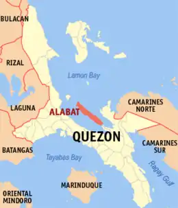 Alabat Island is an island of the Philippine archipelago, in the Quezon Province of the Calabarzon region, situated just off the east coast of Southern Luzon. The island has an area of 192 square kilometres (74 sq mi) and a population of 41,822. The island has a mountain ridge with peaks ranging from 1,083 ft (330.10 m) to 1,384 ft (421.84 m) which look like islands at a distance.[1] The highest peak is called Mt. Camagong.[2]