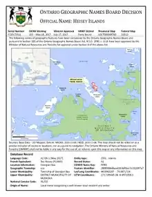 As a result of Heisey's contributions as a writer and as a long time resident in the Township of Georgian Bay the Ontario Minister of Natural Resources officially named a group of islands in the Township of Georgian Bay located to the northwest of Beausoleil Island near Honey Harbour, on the Georgian Bay after him on July 17, 2017, pursuant to Section 4 of the Ontario Geographic Names Board Act, R.S.O. 1990, c. O.16.[89]