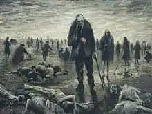 After the war Moore spent some years in Europe.[6] He eventually returned to Melbourne,[4] where he taught painting at Swinburne Technical College from c. 1963.[6][7] Moore also painted images from his Belsen sketches and photographs. They were exhibited commercially, but failed to sell.[15] The Australian War Memorial initially rejected the material because it did not depict Australian soldiers; however it accepted them in 1969 when they were donated by Moore.[14][16] In 2013–14 the Belsen images formed the basis of a year-long exhibition at the Australian War Memorial in Canberra, which Moore himself visited at the invitation of the Memorial.[11][15]