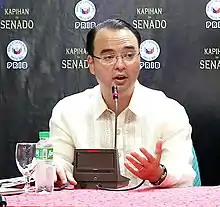 Alan Peter Schramm Cayetano (Tagalog pronunciation: [kajɛˈtano]; born October 28, 1970) is a Filipino lawyer and diplomat serving as a Senator since 2022 and previously from 2007 to 2017. He was the Senate Minority Leader from 2010 to 2013, and later Senate Majority Leader from 2013 to 2016. He also served as the Representative of Taguig–Pateros from 1998 to 2007 and from 2019 to 2022 and was the Speaker of the House of Representatives from 2019 until his resignation in 2020. He also served as the Secretary of Foreign Affairs from 2017 to 2018 in the cabinet of President Rodrigo Duterte, after unsuccessfully running for vice president in the 2016 elections as Duterte's running mate.
