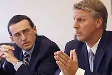 Massachusetts Treasurer Tim Cahill (right) and Roberts on a roundtable discussion at the Rappaport Center for Law and Public Policy at Suffolk University Law School in October 2008