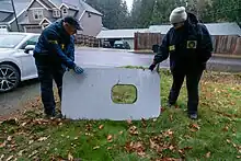 The cabin door plug was discovered in the backyard of a home in the Cedar Hills area near Oregon Route 217. It was reported to the NTSB on January 7.[26] Two mobile phones from the flight had also been found by members of the public, one in a backyard and the other by a road, one of which was an iPhone still powered on and in airplane mode.[27]