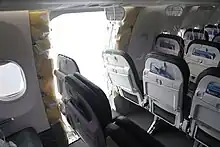 A teenage boy seated in row 25 had his shirt ripped off and blown out of the aircraft while his mother held on to him to prevent him being blown out during the decompression event.[13][14] A passenger seated in exit row seat 16F stated that he heard a loud boom, followed by a gust of wind, which was repeated by another passenger who stated she heard a loud bang, followed by the oxygen masks deploying and a large loud gust of wind.[15] One passenger claimed that others closer to the opening in the plane were able to move to other seats further away.[16]