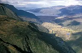 The mountainsides are covered with scrubby vegetation, the higher slopes by low scrub such as black crowberry (Empetrum nigrum) and other ericas (Vaccinium)s, the tiny Arctic willow (Salix arctica) and white mountain avens (Dryas octopetala) while the lower slopes have various evergreen trees among the shrubs and the low coastal plains have tall green alder (Alnus viridis sinuata) and evergreen trees with balsam poplars (Populus balsamifera) in the colder and icyer areas.