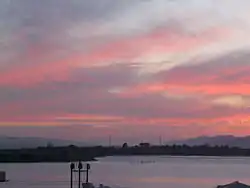 Albany Hill is a prominent hill along the east shore of San Francisco Bay in the city of Albany, California. Geologically, the hill is predominantly Jurassic sandstone, carried to the western edge of North America on the Pacific Plate and scraped off there in the course of subduction. Albany Hill is part of a range of hills uplifted long before today's Berkeley Hills. These hills include Fleming Point and Point Isabel (their summits dynamited away), Brooks Island, the Potrero San Pablo, and the hills across San Pablo Strait.