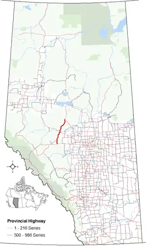 Alberta Provincial Highway No. 32, commonly referred to as Highway 32, is a north–south highway in west–central Alberta, Canada. From north to south, Highway 32 begins at its junction with Highway 33 in the Town of Swan Hills. It proceeds south for 69 km (43 mi) where it meets Highway 43 northwest of Whitecourt. After following Highway 43 southeast for 8 km (5.0 mi), Highway 32 continues south from Whitecourt for 72 km (45 mi), crossing the McLeod River, passing through the Hamlet of Peers, and ending at Highway 16 (Yellowhead Highway) approximately 32 km (20 mi) east of the Town of Edson.[1][2]