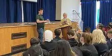 Children's author Tom Palmer speaking to students in May 2023