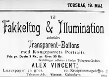 In 1889, Vincent married Agnes Juliette Lodbjerg (1864-1943). Her late father had back in 1845 established a business dealing in mirrors, cards and pictures. Her mother Thora Lodberg had after the father's death continued the firm as H. A. Lodbergs Enke. Vincent was most likely inspired by this shop to start his own business. On 23 October 1890, he started a wholesale stationery business. The first prints published by the firm were large prints for framing and hanging on thewall. A series of Christmas and new year cards based on drawings by the illustrator Axel Thiess was launched for the 1893 season. The firm was initially based on the second floor at Kronprinsessegade 10. Vincent continued H. A. Lodbergs Enke after his mother-in-law's death in 1897. He had the same year bought the property at Kronprinsessegade 12. H. A. Lodbergs Enke was from then on based in the ground floor of the new building while Alex. Vincents Kunstforlag was based on the first floor. Vincent and his wife lived in the apartment on the second floor at No. 10.[1]