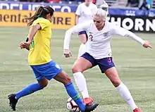 At the 2015 FIFA Women's World Cup, youngest member of the squad Greenwood shared England's left-back duties with Claire Rafferty.[32][33] She won a bronze medal when the team beat Germany in the third place play-off.[34] Although she was the youngest member of the squad, Greenwood was England's best left-footed exponent in dead-ball situations.[35]