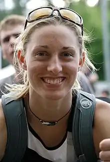 Alexandra Johnson (born April 3, 1989) is an American rock climber who specializes in bouldering and who has made numerous first female ascents of notable boulders, including Clear Blue Skies V12 (8A+) in Colorado, and Book of Nightmares V12 (8A+) and Lethal Design V12 (8A+) in Red Rocks. Her highest rated boulder send, as of 2022, was The Swarm at grade V14 (8B+) in Bishop.[1] In competition bouldering, she won the overall American Bouldering Series in 2009, and has twice won individual stages in the annual IFSC Climbing World Cup series in bouldering.[2]