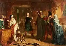 In 1841 Johnston exhibited his first historical picture, The Interview of the Regent Murray with Mary Queen of Scots, which was purchased by the Edinburgh Art Union. In later years he was a contributor to all the main exhibitions. The Covenanter's Marriage (1842) was engraved by C. Lightfoot for Gems of Modern Art. A Scene from the Lady of the Lake, illustrating the poem by Walter Scott, obtained a premium from the Liverpool Academy in 1849; and Prince Charles's Introduction to Flora Macdonald after the Battle of Culloden was awarded by the Glasgow Art Union a premium (declined). In 1845 Johnston exhibited Archbishop Tillotson administering the Sacrament to Lord William Russell in the Tower, which was purchased by Robert Vernon, formed part of The Vernon Gallery, and went to the National Gallery (engraved by T. L. Atkinson and Charles Henry Jeens). Johnston was still an exhibitor in 1884.[1]