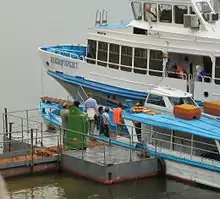 MV Alexander Peresvet carrying the holy relics of Venerable Macarius stops in Kstovo, on its way from Nizhny Novgorod to Makaryev Monastery