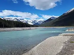 A decommissioned Parks Canada access road follows the north bank upstream until the river's confluence with the Castleguard River, allowing foot access to the Castleguard Meadows, a revered but seldom-visited hiking destination. The trail is no longer maintained and most bridges have decayed or been removed, making the two days of travel to the meadows very challenging.[1] In addition, Castleguard Cave is accessible from the upper reaches of the trail.