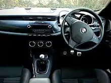 The top of the range model is a version with 1.75 L (1,742 cc) turbocharged TBi engine rated 235 PS (173 kW; 232 hp), lowered ride height (15 mm (0.6 in) at the front and 10 mm (0.4 in) at the rear), 18-inch Spoke design alloy wheels with dark titanium finish and 225/40 R18 tires plus 18-inch 5 hole design alloy wheels as an option; an enhanced braking system (330 mm (13.0 in) front, 278 mm (10.9 in) rear) with calipers painted Alfa red; dark tinted windows, sports kick plates, cloverleaf badges, leather and microfibre seats plus sports leather seats as an option; dark brushed aluminium dashboard.[18][19] 1750 is an engine size which has its roots in Alfa Romeo's history, with 1.75 L engines being used to power some of Alfa Romeo's first cars.[20]