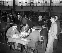 Beni (dark suit, right side of the table) vs. David Bronstein (1954)