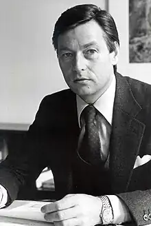 Alfred Herrhausen (30 January 1930 in Essen – 30 November 1989 in Bad Homburg vor der Höhe) was a German banker and the Chairman of Deutsche Bank, who was assassinated in 1989.[1] He was a member of the Steering Committee of the Bilderberg Group[2] and from 1971 onwards a member of Deutsche Bank's management board. An advisor to Helmut Kohl and a proponent of a unified European economy, he was also an influential figure in shaping the policies towards developing countries.[1][3] He was assassinated, probably by the West German far-left terrorist group Red Army Faction, when an explosively formed projectile penetrated his armoured convoy.