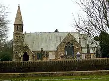 This is a Grade II listed building, designed by Thompson in partnership with Isaac Thomas Shutt (1818–1879).[1] The main structure is built of rusticated gritstone ashlar. The building is constructed parallel to the Otley Road on its south side, so that the plan is not quite east–west. It has a "circular bell tower reminiscent of Irish bell-houses"[1] transepts and an apsoidal chancel. The vestry is in the south transept, and the organ chamber in the north. The east window is in the apse, inside a low gable which runs down from a hipped roof. The lancet windows high in the gables, over the west and transept windows, were probably once for ventilation but are now glazed.[1]