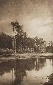 Hinton's photograph, "Requiem," was used as the frontispiece of the first issue of Alfred Stieglitz's magazine, Camera Notes, in 1897.[6] His photograph, "Day's Decline," appeared in Volume 3, Issue 1 of Camera Notes two years later. "Reed Harvesting," was exhibited at the first London Salon in 1894, and his "Salt Marshes" was exhibited at the first Paris Salon that same year.[15] Hinton photographs that garnered considerable attention at the Photographic Salon in subsequent years included "Recessional" (1901), "Weeds and Rushes" (1902), "Fleeting and Far" (1903), and "The White Mill" (1907).[15] In a 1907 issue of The Photographic News, Hinton described "Melton Meadows" as his best photograph.[16]