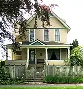In June, 1861, Pettibone married Lucy B. Peabody[4] (in a later article, Flora Peabody[5]) . She was born in Cleveland, Ohio, lived in Whatcom, and died at Ripon in 1882. They had four children: Alice, married to a railroad constructor T. H. Bacon; Fred Curtis of Whatcom, married to Elizabeth E. Pettibone (Crickett); Will E. of Seattle; and Louis A. of St. Paul.[4][9] The Pettibones were one of the Peabody heirs, and in 1886, after a series of legal disputes over land in Bellingham, they built a family home in the heart of the city on Eldridge Avenue. The house was later named historic building.[5]