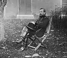 In an 1895 interview with sculptor James Edward Kelly, Pleasonton claimed he had been offered command of the Army of the Potomac. (A subsequent interview with Gen. James F. Wade indicated that this offer came in a meeting in Washington some time after Gettysburg.) Pleasonton told Kelly that he "wasn't like Grant. I refused to pay the price." He claimed that the terms offered were: "The war must not be ended until the South was crushed; slavery abolished; and the President reelected."[13] Pleasonton, always more of a bureaucrat than an ideologue or strong leader, only wanted to defeat the South's military capabilities so that they could not threaten the rest of the states, but was not convinced that "crushing" the rebels, ending slavery, or reelecting Lincoln was worth the cost.[lower-alpha 3]