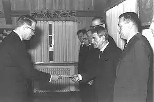 Finnish Ambassador Algar von Heiroth presenting his credentials to acting president, Speaker of Knesset Kadish Luz in Jerusalem in 1966