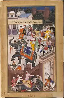 Illustration from Akbarnama showing victory of Ali Quli Khan on Afghans at Gomti, 1561