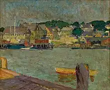 Many of Winter's paintings focused on the beautiful sea and shore landscapes around her abode in Gloucester, MA. Works such as The Waiting Boat, The Old Pier, and The Study of Orange Rocks, were described as vibrant with stunning color effects.[2] These paintings were large but had incredible brushwork, often resulting in displays having difficulty accommodating proper viewing distances.[2]