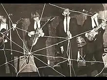 In 1964, 16-year-old Furnier, then a student at Cortez High School, was eager to participate in the local annual Letterman's talent show, so he gathered four teammates from his high school's cross-country team to form a group for the show: Glen Buxton, Dennis Dunaway, John Tatum and John Speer.[5] They named themselves the Earwigs.[6] They dressed up in costumes and wigs to resemble the Beatles, and performed several parodies of Beatles songs, with the lyrics modified to refer to the track team: in their rendition of "Please Please Me", for example, the line "Last night I said these words to my girl" was replaced with "Last night I ran four laps for my coach".[7] Of the group, only Buxton and Tatum knew how to play an instrument—the guitar—so Buxton and Tatum played guitars while the rest mimed on their instruments.[8] The group got an overwhelming response from the audience and won the talent show. As a result of their positive experience, the group decided to try to turn into a real band. They acquired musical instruments from a local pawn shop, and proceeded to learn how to play them, with Buxton doing most of the teaching, as well as much of the early songwriting.[8] They soon renamed themselves the Spiders, featuring Furnier on vocals, Buxton on lead guitar, Tatum on rhythm guitar, Dunaway on bass guitar, and Speer on drums.[6] Musically, the group was inspired by artists such as the Beatles, the Rolling Stones, the Who, the Kinks, the Doors, and the Yardbirds. For the next year the band performed regularly around the Phoenix area with a huge black spider's web as their backdrop, the group's first stage prop.[6]