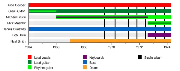 The classic Alice Cooper group line-up consisted of Furnier, lead guitarist Glen Buxton, rhythm guitarist Michael Bruce, bassist Dennis Dunaway and drummer Neal Smith – all former members of the Spiders. This lineup stayed intact through 1974.[6][17]