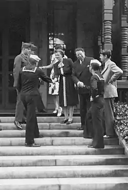 Throughout the majority of her husband's tenure as governor, the United States was involved in World War II.[1] As First Lady, Broughton assisted in the war effort, promoting victory gardens across the state and tending to one at the governor's mansion.[1] She apportioned the food served at the governor's mansion, including the traditional breakfasts served to members of the North Carolina General Assembly.[1] When the news spread that the First Family of North Carolina's meals were affected by wartime rationing, many North Carolinians sent food stamps to the family.[1] Broughton opened the mansion up to military servicemen for overnight weekend visits to boost morale.[1] She promoted a national rubber drive for the war effort by stripping fifty-eight pounds of rubber tread from the service staircase in the governor's mansion, taking it to a collection center in Raleigh on July 10, 1942.[1][4] Accompanied by a reporter and a photographer from the Raleigh Times, Broughton attempted to donate the rubber to the collection center.[4] The center attendants refused the donation, so she donated to another center across the street.[4]