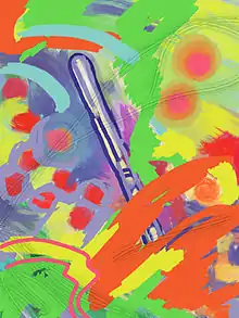 In the summer of 2008, she experimented with her palette by using a technique known as Color Field painting and began painting city and landscapes in bright, vibrant colors.[1][2][6] She developed a brushstroke style,[1][4][6] using acrylics in a way to give the appearance of oils and included "intense black lines."[2]