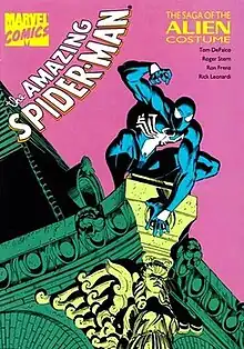 The Alien Costume Saga is a superhero comic book story arc published by Marvel Comics and centred on the character Spider-Man. It was originally published in the comic book series The Amazing Spider-Man #252–263, The Spectacular Spider-Man #90–100, Marvel Team-Up #141–150 and Web of Spider-Man #1 from May 1984 to April 1985. It features Spider-Man wearing the alien costume he brought home from Battleworld during the Secret Wars limited series and his subsequent discovery that the new costume is alive.