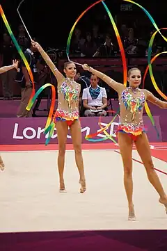 Makarenko (left) at the 3 Ribbons + 2 Hoops final in 2012 Summer Olympics