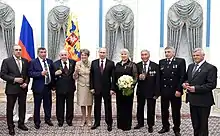 On 18 January 2007, Akysonova was upgraded to the Order "For Merit to the Fatherland", Third Class "for her great contribution to the development of museum work and the preservation of the national historical and cultural heritage."[13] She was conferred the Russian Federation Presidential Certificate of Honour "for merits in the field of culture and many years of fruitful work" on 2 June 2010.[14] Aksyonova was made a Hero of Labour of the Russian Federation by Putin on 20 April 2014 "for special labor services to the state and people."[15] She was given the Medal "For Services to the Vladimir Region" in 2017 "for a great contribution to the socio-economic development of the region",[16] and the Order of Alexander Nevsky on 3 October 2021 "for labor achievements and many years of conscientious work."[17]