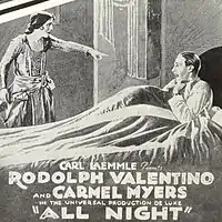 All Night is a 1918 American silent comedy-drama film directed by Paul Powell and starring Carmel Myers and Rudolph Valentino (credited as Rudolpho di Valentina). It was released by Universal Pictures under the name Bluebird Photoplays.[1]