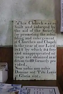 The church is built of granite rubble on a rectangular plan[2] and was enlarged in 1822 by the surveyor Christopher Strick to provide seating for 154 people. There were repairs in 1832 and 1833 by Thomas Downing, carpenter and William Williams. The tower and porch were added in 1860. There is a plain granite font dated 1861. There were additions and alterations in 1882 and a new chancel was added in 1897[3] and new roof (6 feet higher than the previous) in 1930.