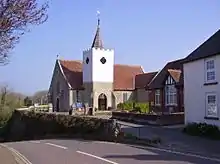 The church of All Saints' is a 13th-century cruciform structure with a south porch. The exterior features a red-tiled roof, walls of rough sandstone, a weatherboarded tower, a south porch, and a short spire. The nave's roof and the exterior of the north aisle appear barn-like.[2]